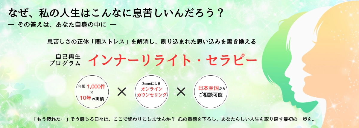 あなたが今「生きづらい」と感じている顕在化されたお悩みは、昔負った心のキズが解消されていないことで発源しています。この、心の奥底に巣食ってしまった闇ストレスを解消しない限り、今後もさまざまな場面であなたの人間関係を構築する足枷となってしまいます。